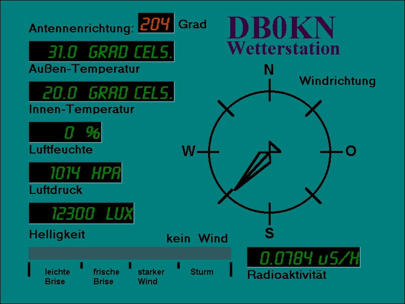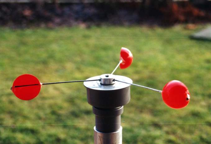 Das Herzstück unserer Wetterstation ist die von der Fa. Conrad in Hirschau angebotene Telemetriewetterstation. Dabei handelt es sich im Prinzip um einen AD-Wandler auf Basis eines C-Control-Mikrocomputersystems mit serieller Ausgabe der Daten. Die Inbetriebnahme stellte sich als problemlos heraus, auch wenn in verschiedenen Publikationen im Internet anderes berichtet wird, dies liegt aber sicher daran, dass wir auf das Memorymodul verzichtet haben und die die Daten direkt auf der seriellen Schnittstelle zum PC schicken. Leider ist die Dokumentation eher dürftig, und der Windmesser funktioniert konstruktionsbedingt leider auch nicht sehr zuverlässig. Der Windmesser liegt nicht wie die anderen Sensoren an einem Analogeingang, sonder am Zähleingang des C-Control-Basic-Bausteins, sondern am Zähleingang. Das Funktionsprinzip ist wie bei einem Fahrradtacho mit einem Reedkontakt und einem Magneten im beweglichem Teil. Nun hat zum Einen die Software ein Problem beim Auswerten der Drehzahl, d.h. wenn das Rad mit den Halbschalen zum Stehen kommt, dann wird immer die zuletzt ermittelte Drehzahl angezeigt. Dies hat den Nachteil, dass bei niedrigen Windgeschwindigkeiten immer auf Wiederholwerte gefiltert werden muss um ein stehendes Aneometer zu erkennen, da wir die Anzeige per DTMF hochtasten, und nur eine Minute stehen lassen und pro Sekunde nur 2 Messwerte übermittelt werden ist dies natürlich ein unschöner Effekt. Zum Anderen hat das Aneometer statt der üblichen 3 Halbschalen 4 Stück, die über Kreuz angeordnet sind. Dies führt dazu, dass sich die Kräfte beim Anlaufen gegenseitig aufheben und das Laufrad zu vibrieren anfängt. Passiert dies wenn sich der Magnet direkt über dem Reedrelais befindet, dann ergibt sich eine Windstärke von ca. 2000 Km/h. Da wir sowieso nur eine Relativanzeige haben und es uns nicht auf die genaue Berechnung und Anzeige der Windstärke ankommt, haben wir uns einen Analogsensor im Eigenbau hergestellt. Als Basis dient der Antriebsmotor aus dem Kassettenteil eines Autoradios, bei dem die Regel-Elektronik überbrückt wurde. Dieser wurde in den Deckel eines 40mm HT-Rohres aus dem Sanitärbereich montiert. Über eine Wellenverlängerung wird ein Aluminiumring montiert, in den drei Fahrradspeichen eingeschraubt sind. Auf den Fahrradspeichen sind drei Kunststoffhalbschalen aus dem Spielzeugautomaten angebracht. Als Nässeschutz diente beim ersten Prototypen der Verschlußdeckel eines größeren HT-Rohres, später wurde aus Gewichtsgründen auf den Deckel einer Spraydose umgestellt. Bei Wind wird nun der Motor als Generator betrieben, und liefert bei stürmischem Wind eine Ausgangspannung von ca. 500 mV. Diese Spannung wird mit ca. 10mV-Auflösung ausgewertet, und über eine Tabelle linearisiert.